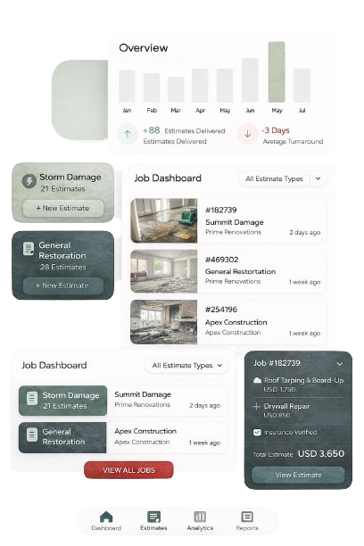 We provide reliable, insurance-ready estimating services designed specifically for restoration companies. Using industry-standard software, we help streamline the estimating process, reduce revision cycles, and improve approval times—so your team can focus on project execution, not paperwork.